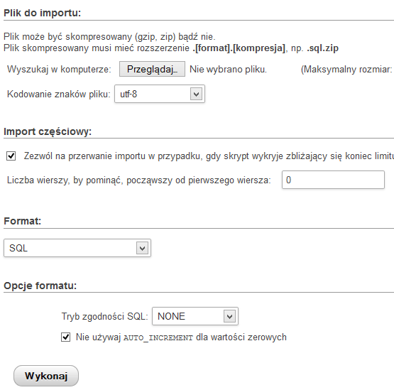 Klikamy na przycisk "Przeglądaj...", na komputerze wybieramy utworzony plik .zip i klikamy "Wykonaj".